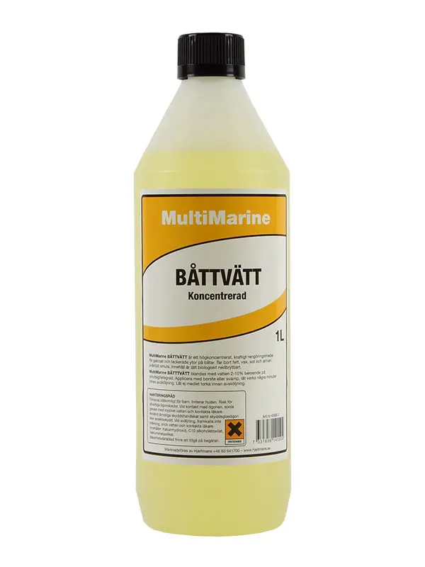 Avfettande grovrengöringsmedel för gelcoat och andra ytor. Effektiv mot vax, olja och hårt sittande smuts. Båttvätten är koncentrerad och blandas 2-10cl medel till 10 liter vatten. Används före alla målning. Skadar ej plexiglas och lämnar inga rester.