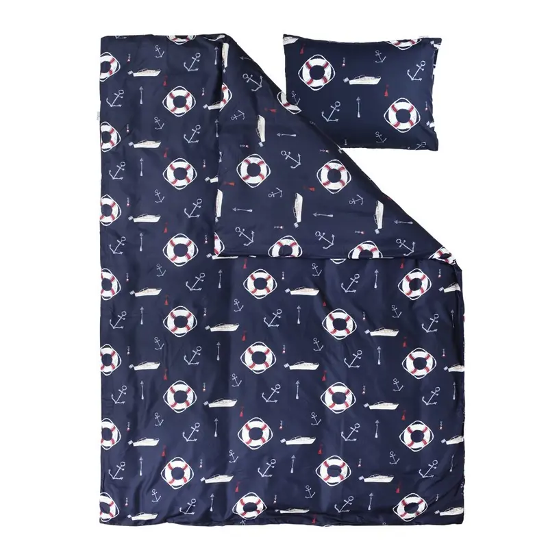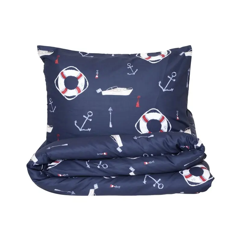 Bäddset av mikrofiber med maritima symboler. Lakan i mikrofiber håller sig torra eftersom de inte drar åt sig fukt till skillnad från lakan av bomull. De torkar snabbt och tar liten plats. Passar därför perfekt till båtliv eller husbil.