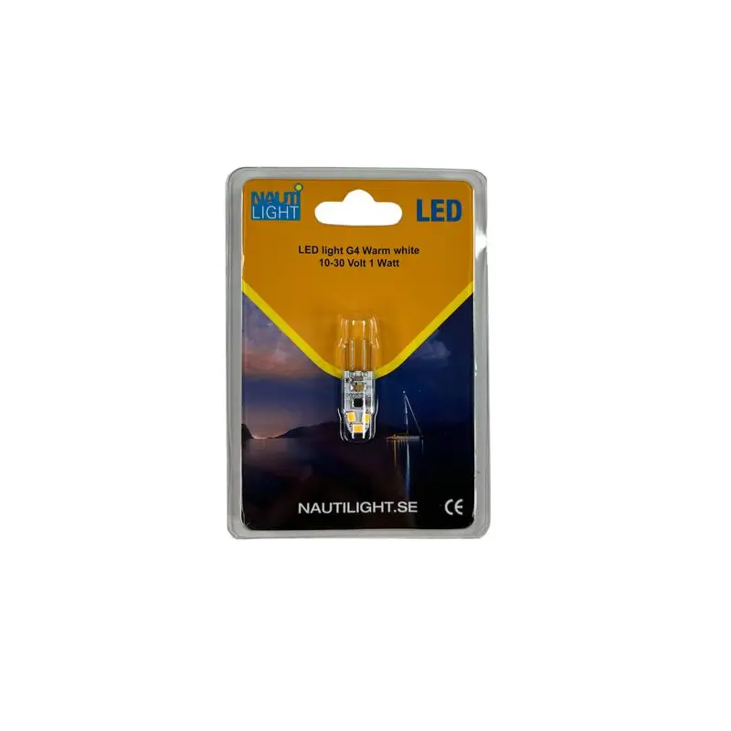 Nautilight LED light G4 Warm white, designad för att möta de höga EMC-kraven i den marina miljön. Lampan är mångsidig, med ett spänningsområde på 10-30 volt, vilket gör att lampan kan användas i olika elsystem.