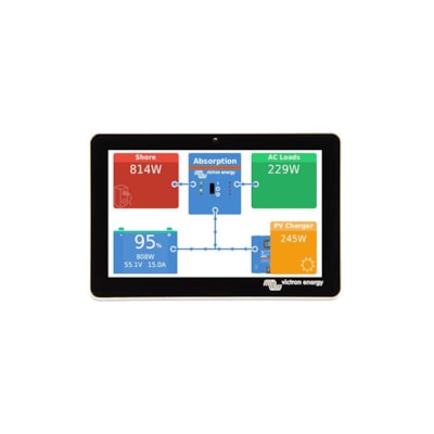 GX Touch 50 är en display till Cerbo GX (säljs som tillbehör art.nr 5499-3850). Touchskärmen på 5" ger dig en direkt översikt av ditt system och gör det möjligt att ändra inställningar på ett ögonblick.