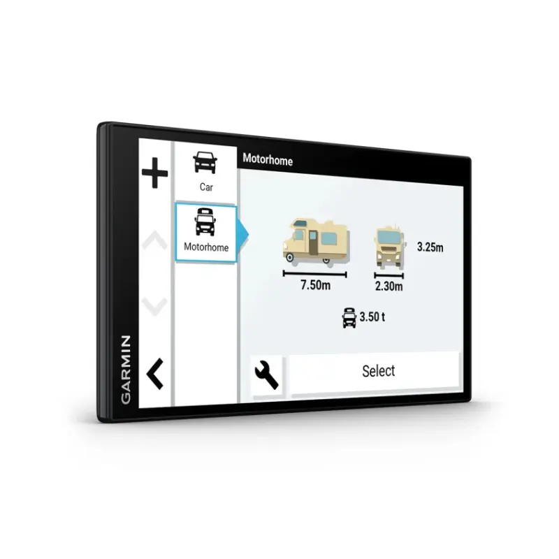 Camper 795 tar hänsyn till storleken och vikten på din husbil och hittar sedan en rekommenderad färdväg1. Du kan även spara profiler för flera fordon eller släpvagnar.