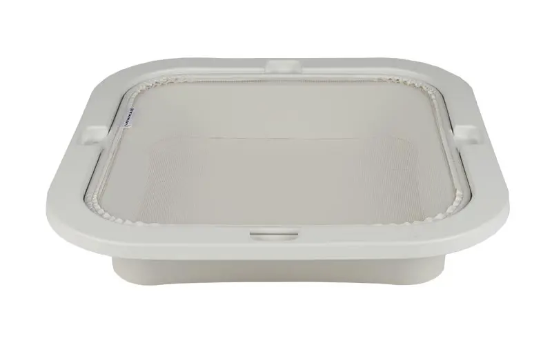 ABS-plast. Inkl löstagbart myggnät. Kapas till önskad däcktjocklek, max 50mm. Till alla Lewmarluckor size 30 i vårt sortiment.