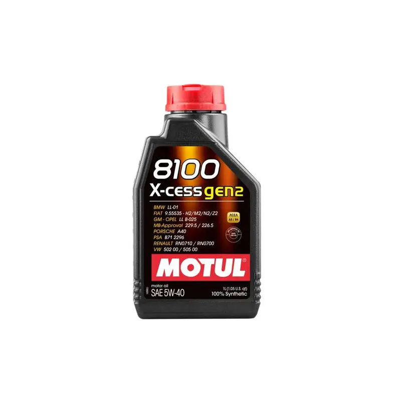 Motul motorolja 8100 5W40 1L helsyntet. Motul 8100 X-Cess Gen2 5W-40 är en högpresterande helsyntetisk motorolja utvecklad för moderna och kraftfulla bensin- och dieselmotorer. Den passar både sug- och turbomotorer med direkt- eller indirekt insprutning och är särskilt framtagen för fordon som fortfarande omfattas av tillverkarens garantikrav. Formulan ger stabil oljefilm, stark värmetålighet och pålitlig motorrengöring även vid hård belastning. Oljan fungerar med ett brett urval av bränslen, inklusive bensin, etanol, LPG, diesel och biodiesel. Motul 8100-serien är känd för sina många OEM-godkännanden och är ett tryggt val för dig som vill ha maximal kompatibilitet och säker motorgång.