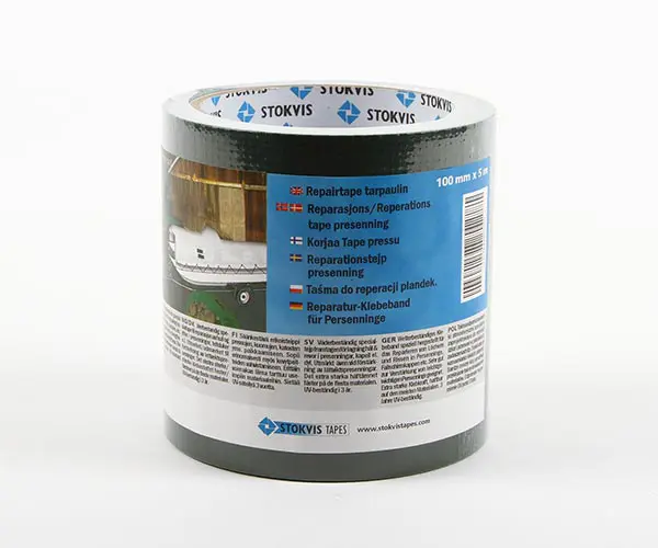 Tejp med mycket god vidhäftning för lagning eller förstärkning av presenning. UV-beständig i 3 år. Rengör alltid materialet före påfästning.